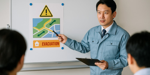 - 気象庁警報、避難準備情報発表後、施設や設備の被害を軽減するための対策と準備、避難経路の確認および指示。