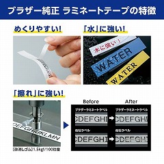 光を反射しにくいマットタイプのラミネートテープです。透明フィルムが表面を保護し、こすっても水にぬれても文字が消えません。