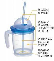 長すぎず飲みやすいストロー。簡単に向きが変えられる飲み口。片手でも両手でも飲みやすいハンドル。シンプルで組み立てしやすいデザインの中にたくさんの工夫が詰まった商品です。