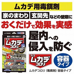 置くだけ簡単。屋外にいるムカデに食べさせて駆除し、屋内への侵入を防ぐ。お子様やペットに安心な容器付き。