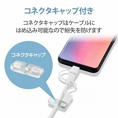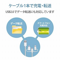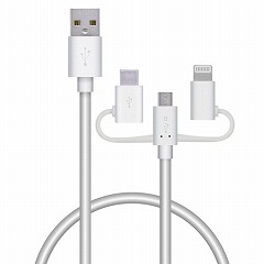 Lightningコネクタ搭載機器、USBType-Cコネクタ搭載機器、USBmicro-Bコネクタ搭載機器の充電/データ通信ができる、変換アダプタつきUSBmicro-Bケーブル。