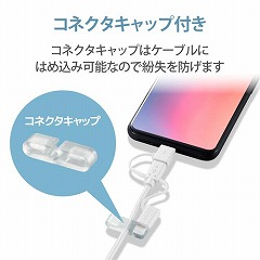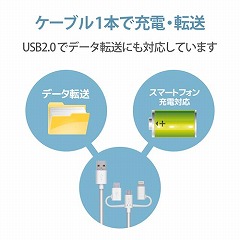 Lightningコネクタ搭載機器、USBType-Cコネクタ搭載機器、USBmicro-Bコネクタ搭載機器の充電/データ通信ができる、変換アダプタつきUSBmicro-Bケーブル。