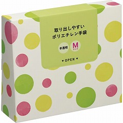 高密度ポリエチレン製の薄手タイプです。手袋が取り出しやすく、ポップなデザインが明るい空間になじむパッケージスタイルとなってます。