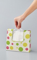 高密度ポリエチレン製の薄手タイプです。手袋が取り出しやすく、ポップなデザインが明るい空間になじむパッケージスタイルとなってます。
