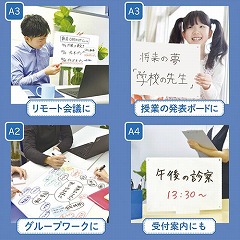 薄くて軽い紙製のホワイトボードです。WEB会議やグループワークなどに便利です。立てかけに便利なスタンド付。