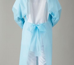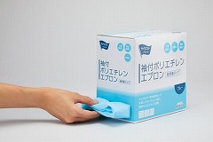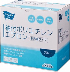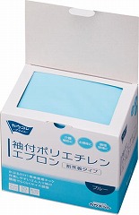 大量購入におすすめの袖付ポリエチレンエプロン!安いのでまとめ買いがお得。袖付なので異物混入の防止に役立つ。腰ひもでサイズ調整しやすいフリーサイズ。使い捨てだから医療介護向け用途でも安心。青色タイプ。