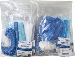 ●セット内容(1袋分)/キャップ1枚、シールド付マスク1枚、グローブMサイズ2枚、シューカバー2枚、ビニールエプロン1枚