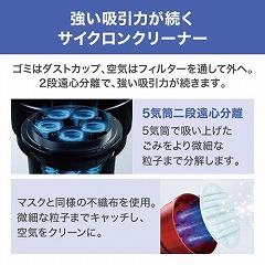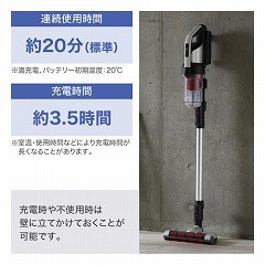 5気筒二段遠心分離で微細なゴミを分離し、強い吸引力が続く、充電式サイクロンスティッククリーナー。約3時間半で充電ができ、1回の充電で最大50分(セーブモード)使用可能。