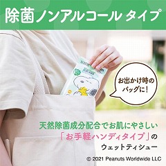 大人から子どもまで人気のスヌーピーデザインの身のまわりも安心してふける除菌ノンアルコールタイプ。お子さまの身のまわりやおもちゃの除菌、汚れ落としにもおすすめ。持ち運びに便利な携帯タイプ。