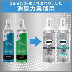 Sanityは消臭力に生まれ変わりました。4連ワイド噴射なので、広い空間を瞬間消臭します。
