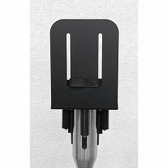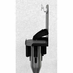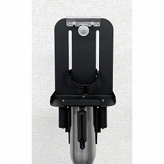 スリムガイドポールに取り付け可能な消毒液台。ベルトを引き出した状態で台の設置が可能です。