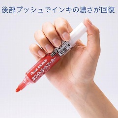 後部プッシュでいつでも濃く書けるホワイトボードマーカー「ノックル」の抗菌仕様。抗菌なので共用しても衛生的。本体軸印刷部分に、抗菌効果を発揮する抗菌剤を配合しています。