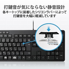 本格静音設計で打鍵音を約69%カット!Windows、ChromeOS、macOSで使用可能。さらに、日々のパソコン操作に安心をプラスする抗菌仕様の有線静音フルキーボード。