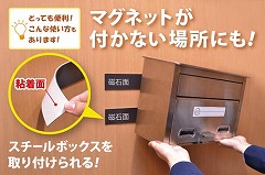 衝撃に強い粘着剤付のマグネットシートです。金属、プラスチック、ダンボールなどに相性が良く、しっかり貼りつきます。また、マグネットも異方性の強力タイプを使用しているのでスチール面にもしっかり付きます。