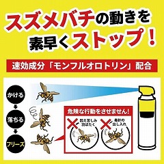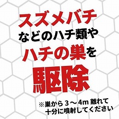 ※魚に対して魚毒性があるので池や水槽などに噴霧粒子が入らないように注意すること。安全のために防護服、保護メガネ、保護マスクなどを必ず着用して使用すること。室内では使用しないこと。ハチ、ムカデなどを駆除するときは、身体の露出部をできるだけ少なくするなど、刺されたり、かまれたりしないように十分注意し、噴射後はすみやかにその場を離れること。駆除したハチは直接手で触れないこと。炎に向かって噴射しないこと。※メーカー都合によりパッケージや仕様が予告なく変更される場合がございます。