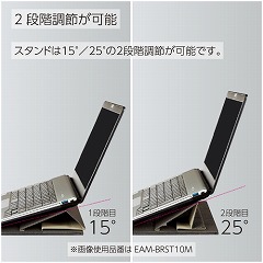 スタンドは15°/25°の2段階調節が可能。スライドボードを引き出すことで、ノートPC手前のスペースを有効活用できます。また、スライドボードがキーボードに干渉しにくいノート筆記台となります。