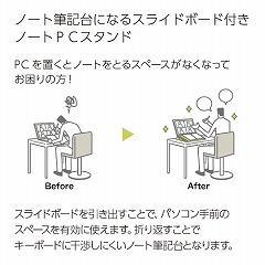 スタンドは15°/25°の2段階調節が可能。スライドボードを引き出すことで、ノートPC手前のスペースを有効活用できます。また、スライドボードがキーボードに干渉しにくいノート筆記台となります。