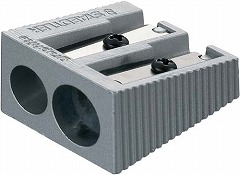 合金製のコンパクトシャープナー。鉛筆用と太軸鉛筆用の二穴タイプ。