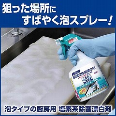 キッチンハイター内最強漂白力!もっちり濃密泡がピタっと密着スプレーで手軽に除菌・漂白・消臭できる台所用漂白剤。まな板・包丁・排水口のごみ受け・食器・ふきんが、こすらずキレイに。