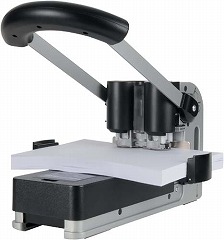 用紙を挟み込むだけで素早くセンター位置が決められる便利なダブルゲージ付きです。紙あて部は可倒式でA4長辺4穴にも対応。