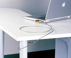 ワイヤーを柱や机の脚等に巻きつけて、多くのパソコンで採用されているPC固定用の3×7mmの長方形のスロットにマイクロロックをとりつけて錠でロックすることで、大切なパソコンの盗難を抑止します。