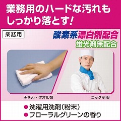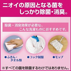 酸素系漂白剤配合。ガンコな汚れをしっかり落とす!ニオイの原因となる菌をしっかり除菌・除臭。変色しやすい生成りや淡色の衣類ほか、食材に接するふきん、おしぼり等にも安心して使えます。