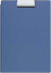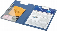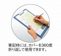 二つ折りタイプのクリップボード。表面にオレフィンが貼ってあるため、柔らかくなめらかな書き心地です。ペンホルダー、名刺を収容できる切り込みがある透明ポケット付きです。