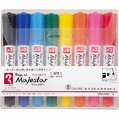 ペン先がポリエステル使用で書き味なめらか、筆記線の割れもしにくい。配送物の仕分けなどに活躍する太・細両用油性マーカー。8色のアソートセット。