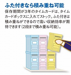 保存期間が3年のタイムカードを便利に管理できるボックス。蓋付きなので2段まで積み重ねての保管もできる。