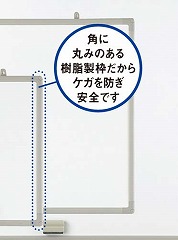 角に丸みのある樹脂製枠だからケガを防ぎ安全な壁掛けホワイトボード。教育現場や病院などにおすすめ。