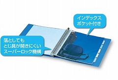 インデックスポケット付きで分類整理しやすい!落としてもとじ具が開きにくいスーパーロック機構になっています。ポケットは表紙と同系色の中紙ありタイプ。