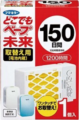 ※どこでもベープ未来150日セット用のワンタッチでお取替えできる取替え用(電池入り)カートリッジです。使用説明書に従って、器具にセットしてご使用ください。※メーカーの都合によりパッケージが予告なく変更される場合があります。※1セット単位でお申し込みください。