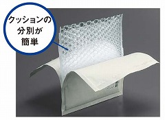 表面紙と内部のエアクッションが簡単に分別できるようリニューアル。ラミネート加工していない表面紙は雑誌古紙としてリサイクルでき、袋状のエアクッションも再利用が可能です。