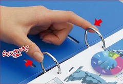 閲覧や抜き差しする頻度が多い書類に。片手で軽くつまむだけでラクに開けられる!下側のリングを閉じると、上側のリングも一緒に閉じます。収容枚数はそのままでスリムに!不透明表紙タイプはこちら。