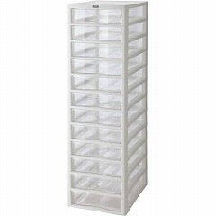 透明ケースで中身が確認しやすい!書類や備品の保管におすすめです。引き出しにはB4用紙・A4ファイルが収納できます。整理に便利なインデックスシール付き。