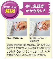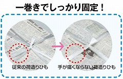 通常の10倍以上の太さの荷造りひも。従来二重・三重に巻いて手間のかかる梱包作業を一巻きで簡単に済ませることができます。さらに持ち手がソフトで手に食い込みにくい、作業効率を重視した商品です。