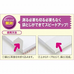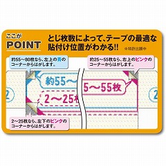 ●特徴/80枚までの書類の袋とじ製本ができます。とじ枚数によって、テープの貼り付け位置が簡単にわかるはくり紙。表裏のバランスよく、きれいに製本できます。
