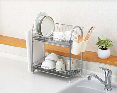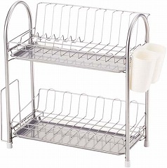 収納力抜群の2段タイプの水切りカゴ。まな板立てや小物ポケット付き!