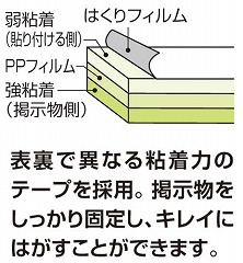 ※必ず掲示物(ポスターなど)側にテープを貼り付けてください。※掲示物からは、テープをはがすことはできません。※表面の弱い紙、薄い紙、印刷面などにご使用になると、紙が破れたり、貼り付けた面にテープが残る場合があります。