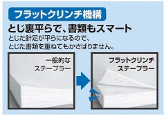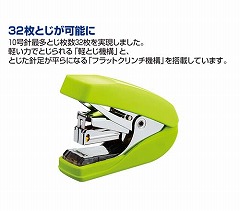 軽とじ機構搭載で、いつも使用している10号針で32枚もの書類を軽くとじることができます。とじた針足が平らになるフラットクリンチ機構。女性の手でもすっぽり収まるコンパクトさで、針を100本装填可能です。