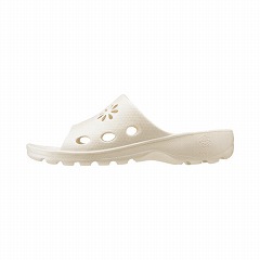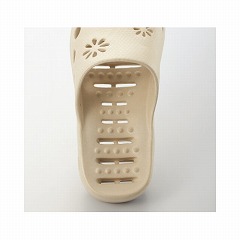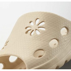 EVA樹脂製で濡れても撥水が良く、底は水がたまらない水ぬけ加工もあってベトつかない。甲部分には、かわいく水切りにも活躍する「花形抜き加工」。