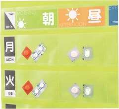 簡易タイプのおくすり服用カレンダー。月曜日から日曜日までの1週間のおくすりを管理でき、1日を朝・昼・夕・寝る前の4区分にできます。