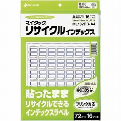 ※各プリンタでの使用は、確認したうえでお使いください。●エコマーク認定番号/05112542●エコマーク使用契約者名/ニチバン株式会社●エコマーク商品ブランド名/マイタック(R)リサイクルインデックス●古紙パルプ配合率100%、リサイクル容易な剥離紙を使用