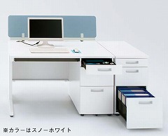 ●材質/天板:(表面)メラミン化粧板(芯材)スチール(仕上げ)ポストフォーム(エッジ・サイド)ABS(エッジ・背面)PP、脚・袖:スチール(焼付塗装)、袖引出前面:ABS、アジャスター:PA
