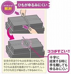 ひもと比べ伸びを5%ダウン。さらに表面を融着させているので、ひも同士が噛み合い結束後のゆるみを軽減できます。切り口がバラつかずに、きれいに結べます。
