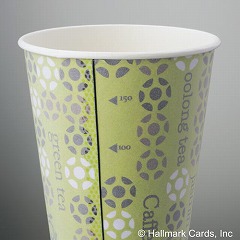 ホールマーク社デザイン。カップ表面にフィルムの気泡層があるので中の飲み物の温度を手に伝えにくく、持って熱く感じにくいカップです。
