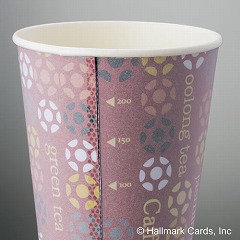 ホールマーク社デザイン。カップ表面にフィルムの気泡層があるので中の飲み物の温度を手に伝えにくく、持って熱く感じにくいカップです。