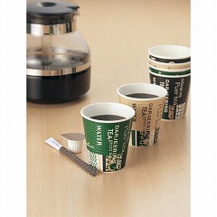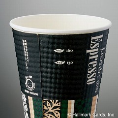 ホールマークデザイン。エンボス(凸凹)加工の紙を巻きつけて断熱性をもたせた、カフェ風のオシャレな紙コップです。