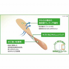 やわらか素材のウレタン不織布と、水に強い粘着剤を使用した救急絆創膏。指まわりや屈曲部にしっかりフィットするので、関節部も曲げやすくデスクでの作業中も快適。ムレも少なくふやけにくい商品です。