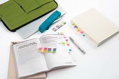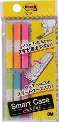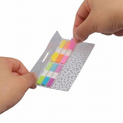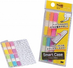 6mm幅のスリムサイズのフィルムふせん。ペンケースにも収納しやすい細長いケース入。貼っても下の文字などが透けて見え、貼った上から字を書くこともできる、つや消し加工フィルムの見出しです。色分けにも便利。